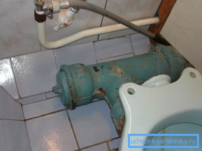 - La verticale était utilisée dans des maisons encore plus anciennes (principalement dans les bâtiments staliniens d’avant-guerre). La prise à l’étage est reliée à la conduite d’égout (échelle), montée sous le plafond de l’appartement inférieur.