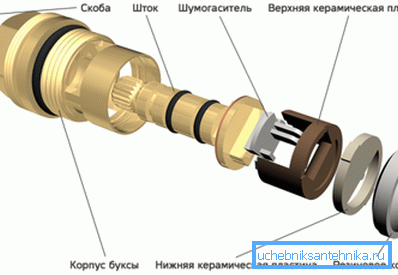 - S'il y a une manette de commande sur le mélangeur pour régler l'eau, cela signifie qu'il y a une cartouche ou une vanne à boisseau sphérique comme vanne d'arrêt. Dans la cartouche, le réglage de l'eau chaude et froide est dû à la rotation de la plaque vers la droite ou vers la gauche - cela vous permet de fermer un canal tout en augmentant le passage sur l'autre (il s'agit de deux entrées).