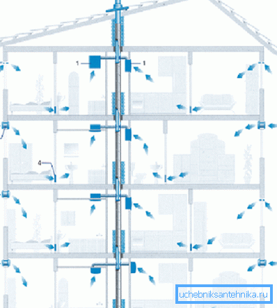 Nous ne décrirons pas tout le système en détail, mais vous devez connaître les éléments suivants: un canal horizontal individuel, que vous pouvez sentir à la main par la fenêtre, relie la cuisine à la salle de bain et aux toilettes. Il ne se connecte pas avec les appartements voisins, mais entre dans un puits commun, divisé en canaux, qui jette déjà de l'air dans le grenier et dans la rue. Il s'avère que pour chaque entrée, un puits vertical est installé.